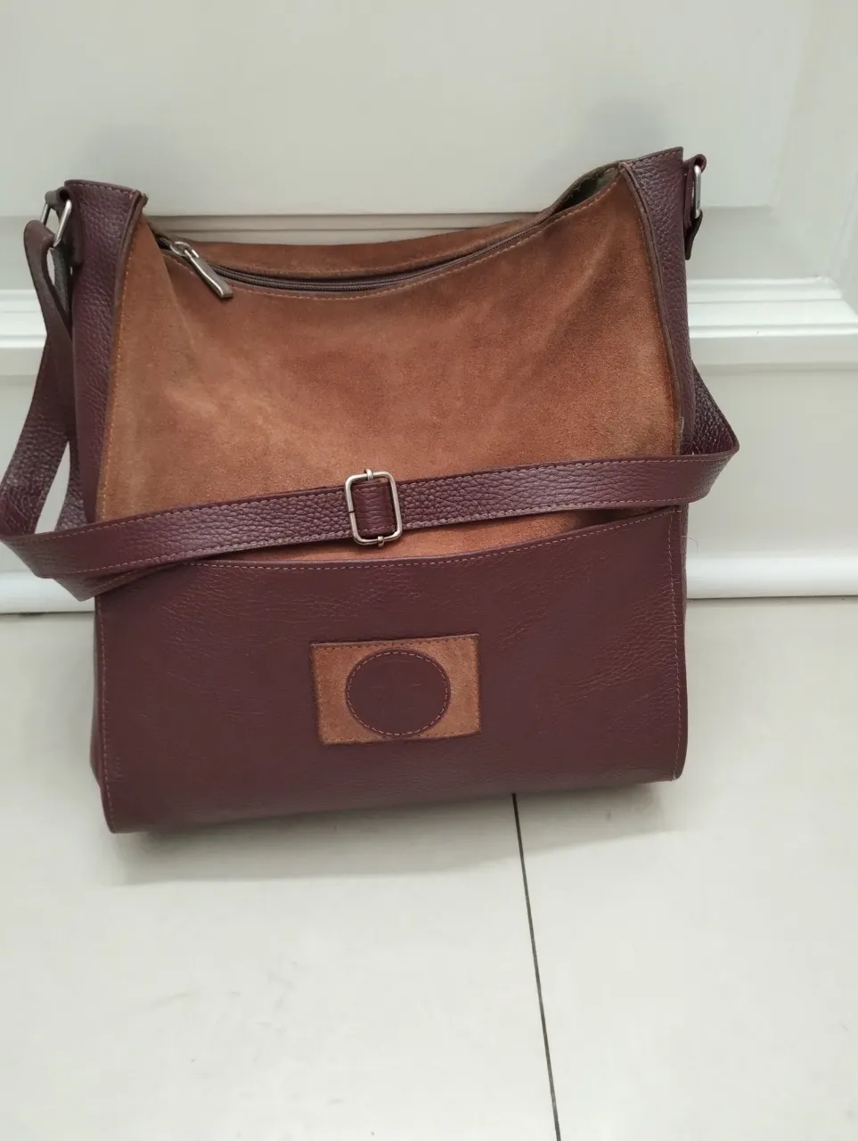 Bolso de cuero y gamuza en tonos marrones. Posee una correa larga ajustable y cierre superior.