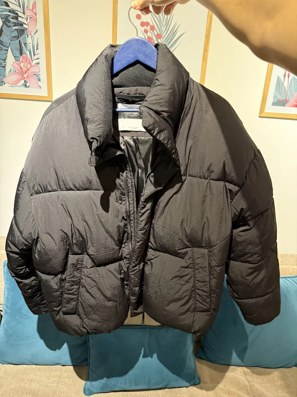 Campera puffer negra de Bershka, ideal para el invierno. Con cuello alto y cierre, perfecta para un look casual y abrigado.