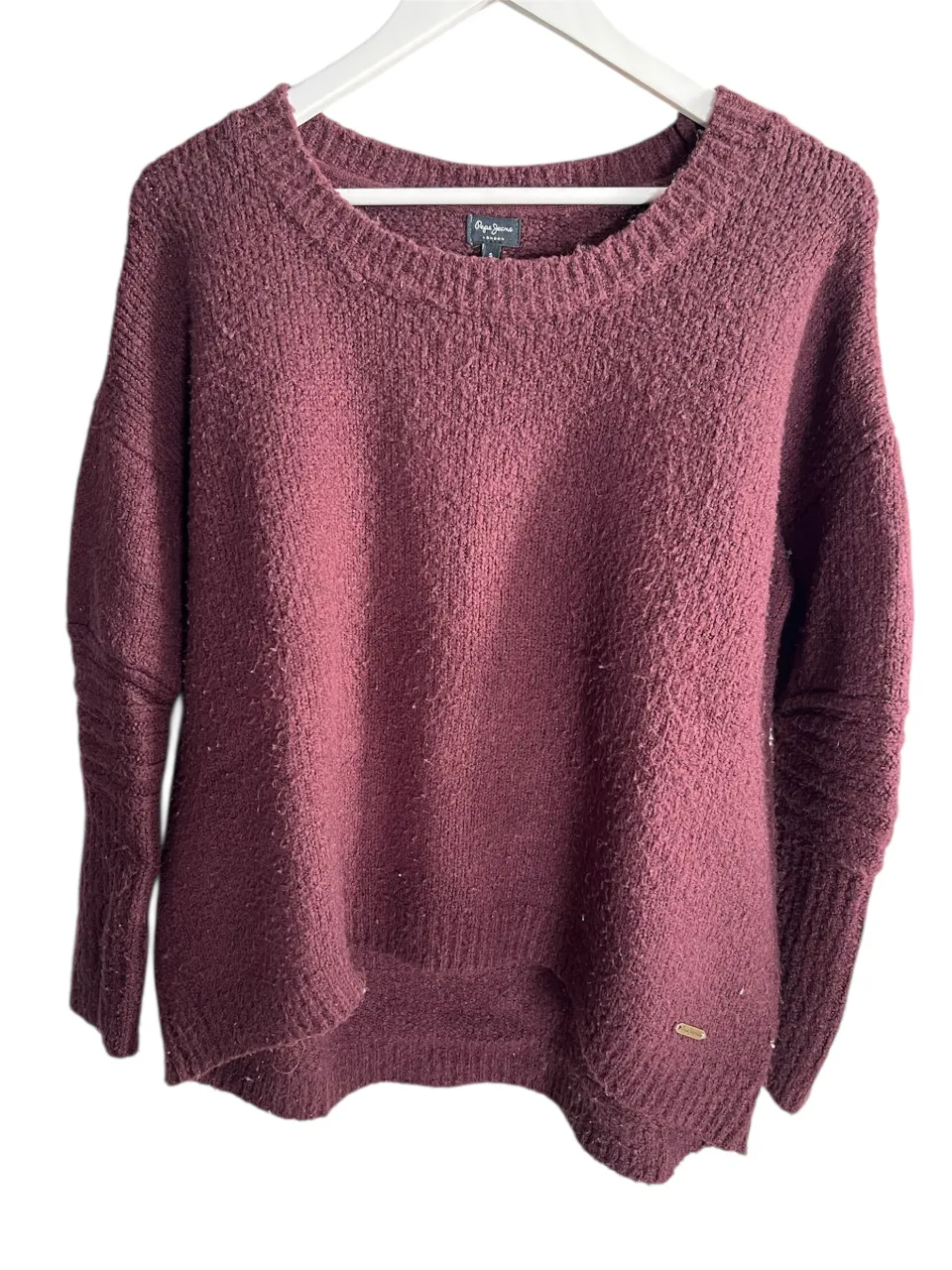 Sweater color bordó con cuello redondo y mangas largas. Posee un detalle metálico con el logo de la marca en la parte inferior. talle S holgado