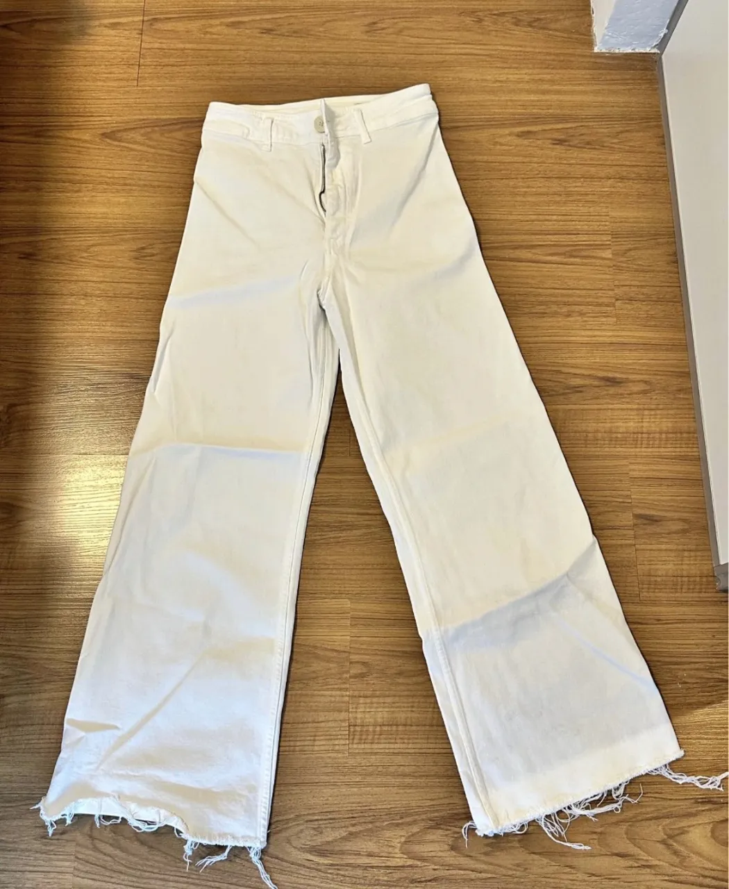 Pantalón blanco ancho, tiro alto, con roturas desflecadas en los bajos. Un básico canchero para cualquier look.