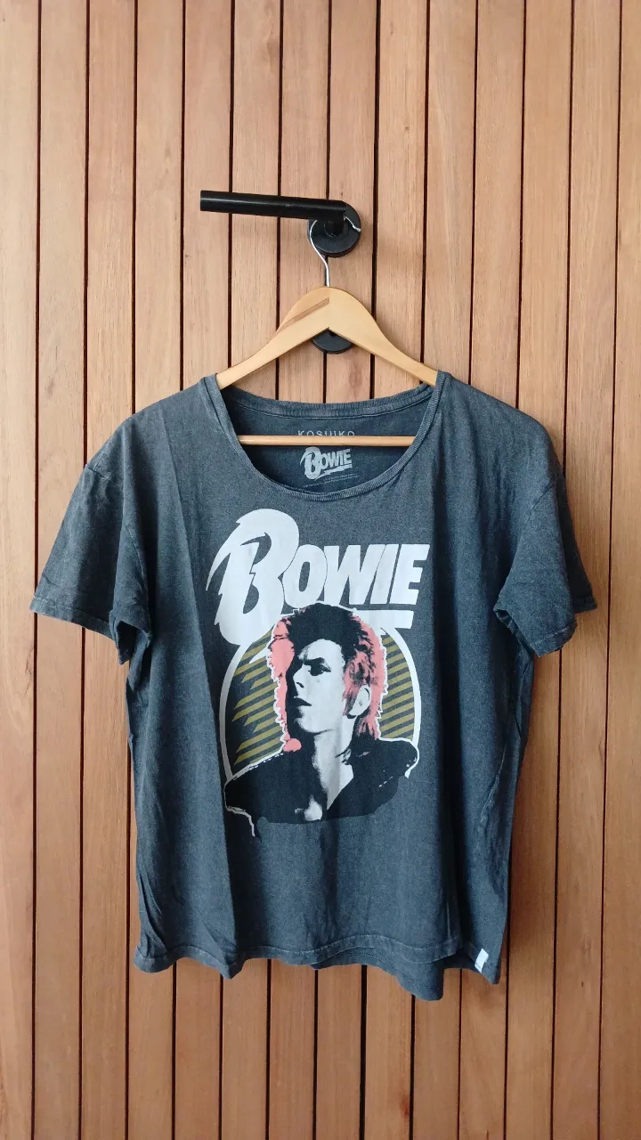 Remera Kosiuko gris azulado de la colección David Bowie. Con estampa, cuello redondo y mangas cortas. El color gastado es original de fábrica. No tiene roturas, está muy cuidada