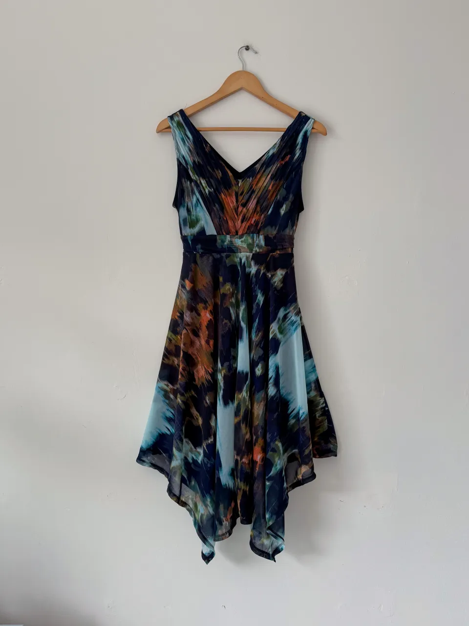Vestido sin mangas con estampado abstracto en tonos azules, naranjas y verdes. Posee cuello en V y falda irregular. Va para un M también.