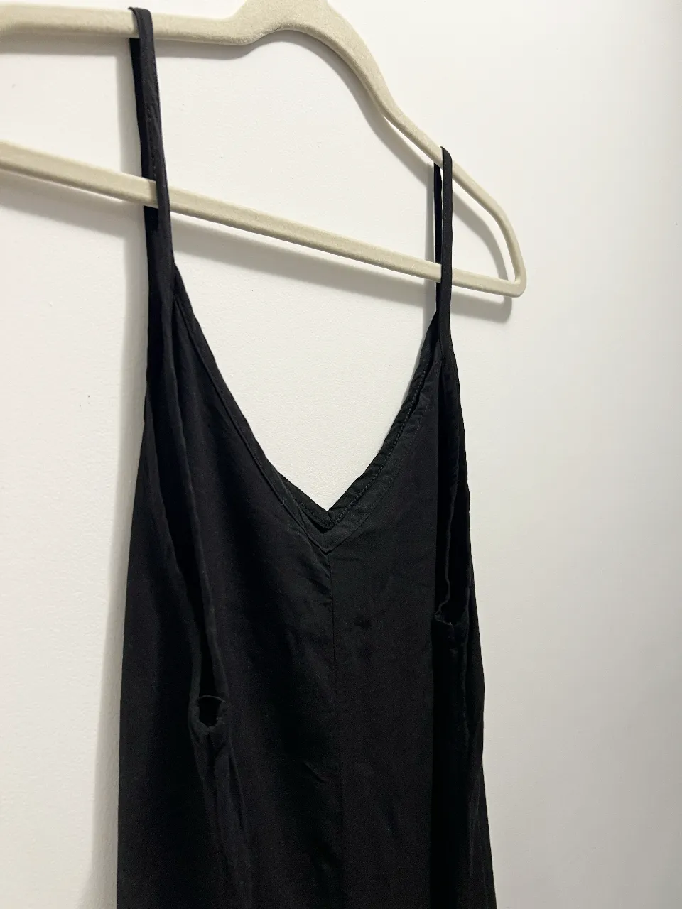 Mono negro de breteles finos, escote en V y bolsillos laterales. Ideal para un look canchero y cómodo.