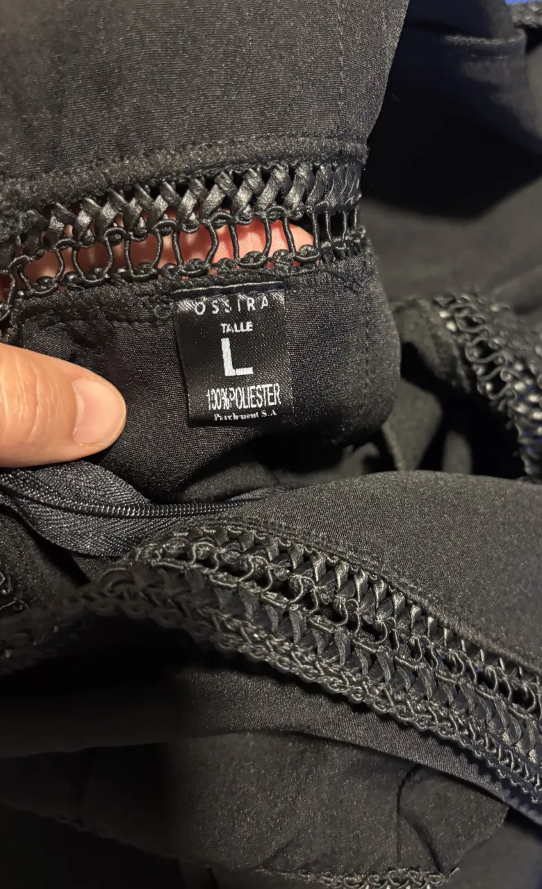 Mono largo negro, con escote en V pronunciado y detalles de tejido en el escote, cintura y mangas. Piernas anchas y fluidas. Ideal para eventos o salidas nocturnas.