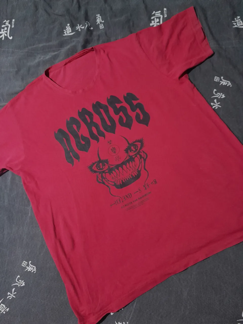 Remera roja AcrossTheRainbow,con estampa de calavera con ojos y dientes afilados,con la palabra ACROSS en la parte superior. Ideal para un look rocker o alternativo.