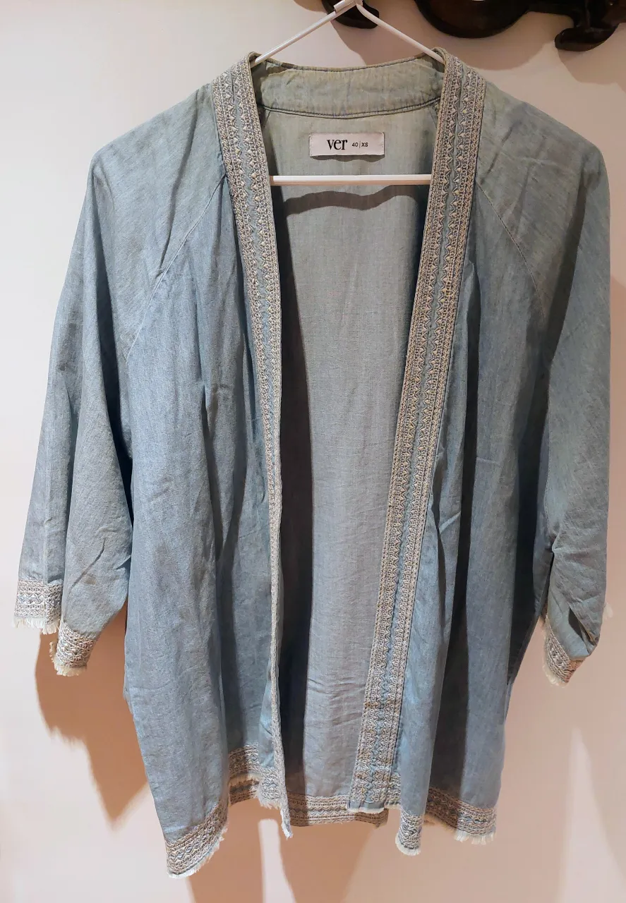 Kimono de jean liviano, ideal para usar abierto como sobrecamisa. Tiene detalles de bordado en los bordes y mangas 3/4. Presenta un poco de decoloración en la zona de los hombros. Un básico canchero para elevar cualquier look.