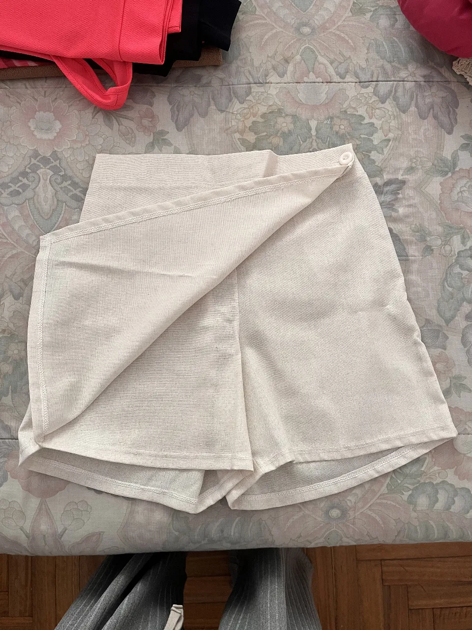 Shorts de lino color crudo, con diseño cruzado tipo pollera y elástico en la cintura. Súper cómodos y cancheros, ideales para el día a día o para un look de playa.