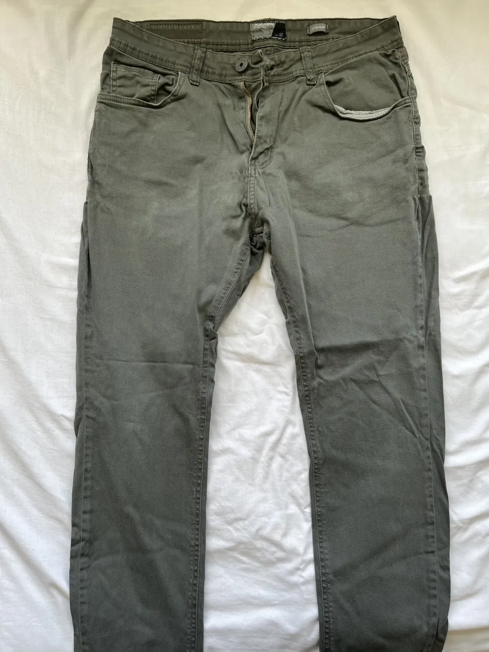 Pantalón de gabardina color verde militar, corte recto y tiro medio. Ideal para un look casual y cómodo. Talle 42 de largo