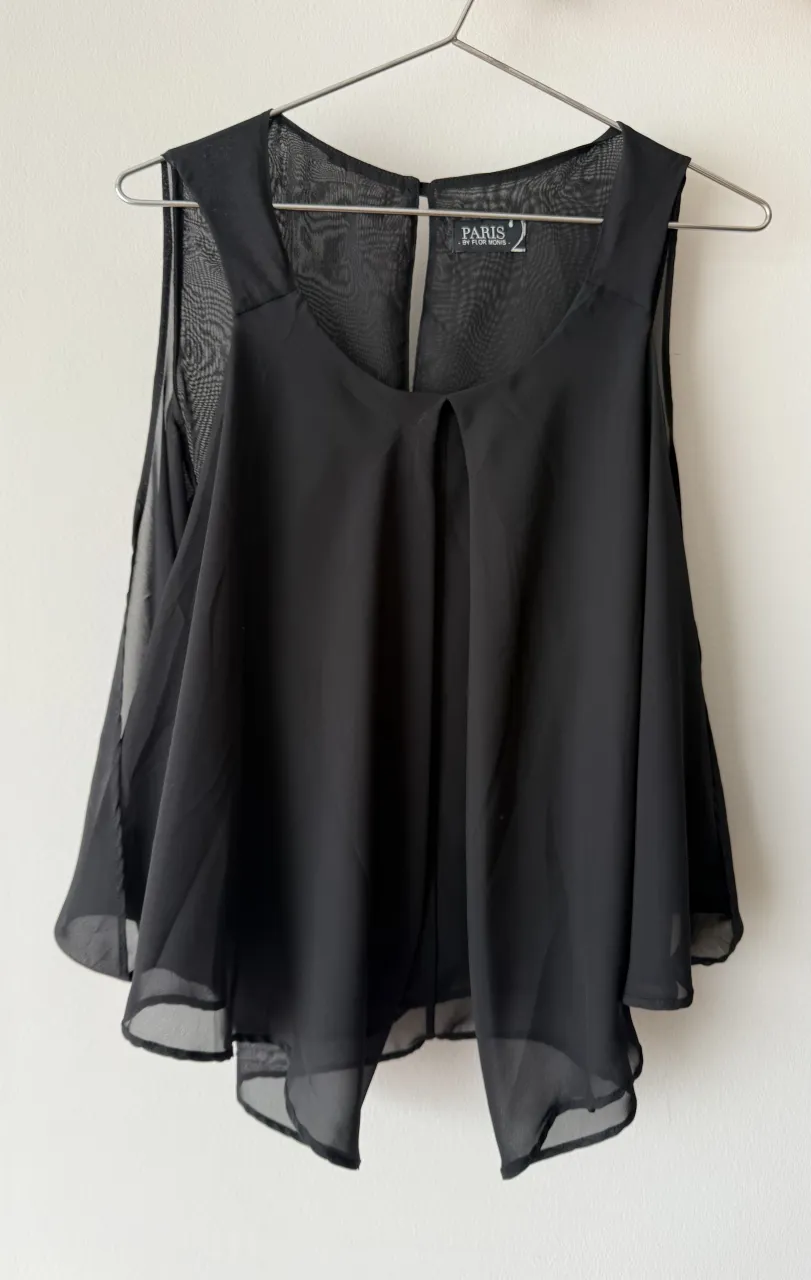 Blusa negra elegante sin mangas con detalle de tela superpuesta en el frente. Espalda con recorte y botón.