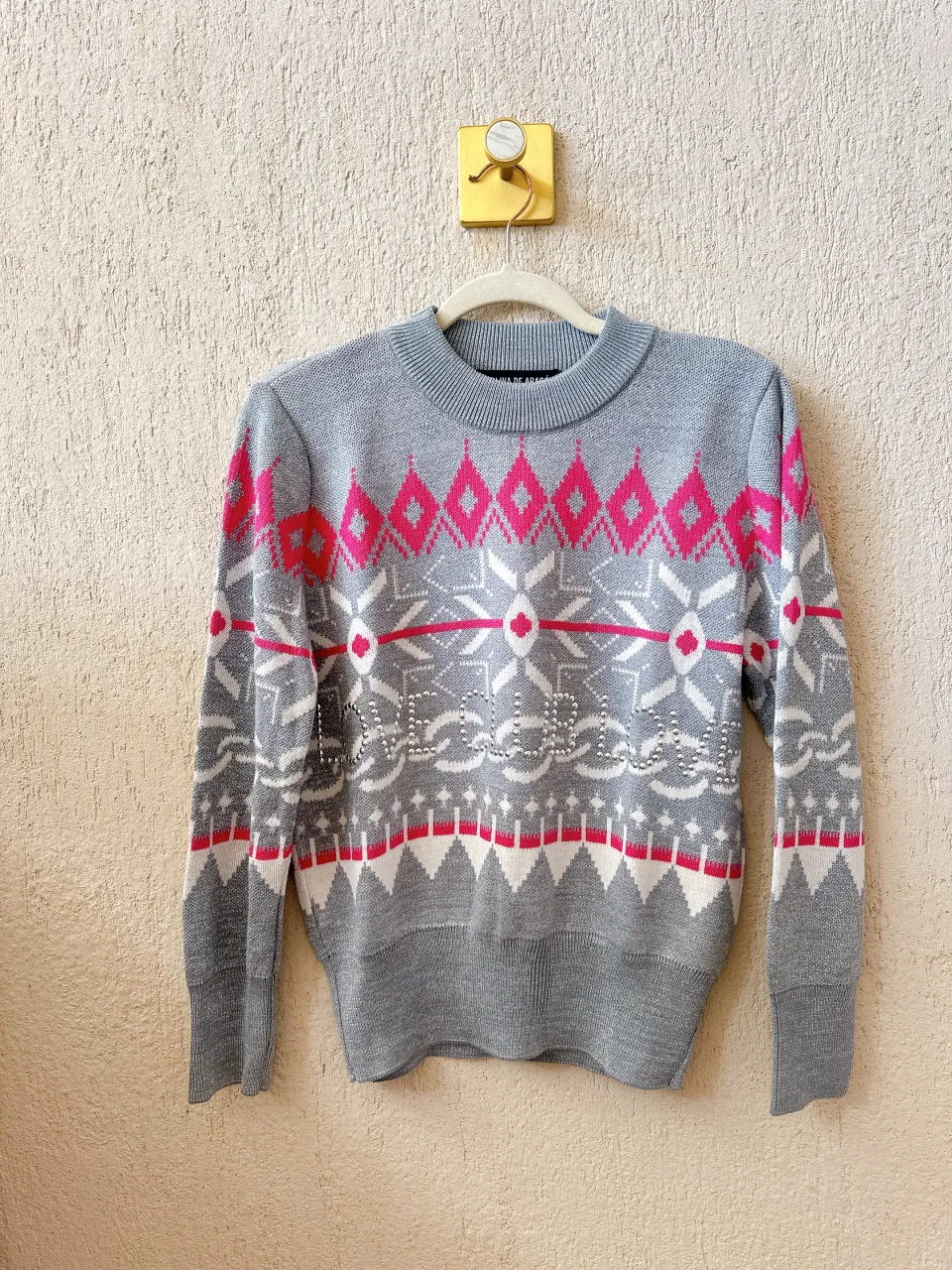 Sweater gris con estampa de rombos y copos de nieve en fucsia y blanco. Detalle de tachas plateadas en el frente que forman la palabra "LOVE". Ideal para un look canchero y abrigado. Medidas Largo total 62cm Ancho de hombro 12cm Largo de manga 60cm Sisa a sisa 52cm
