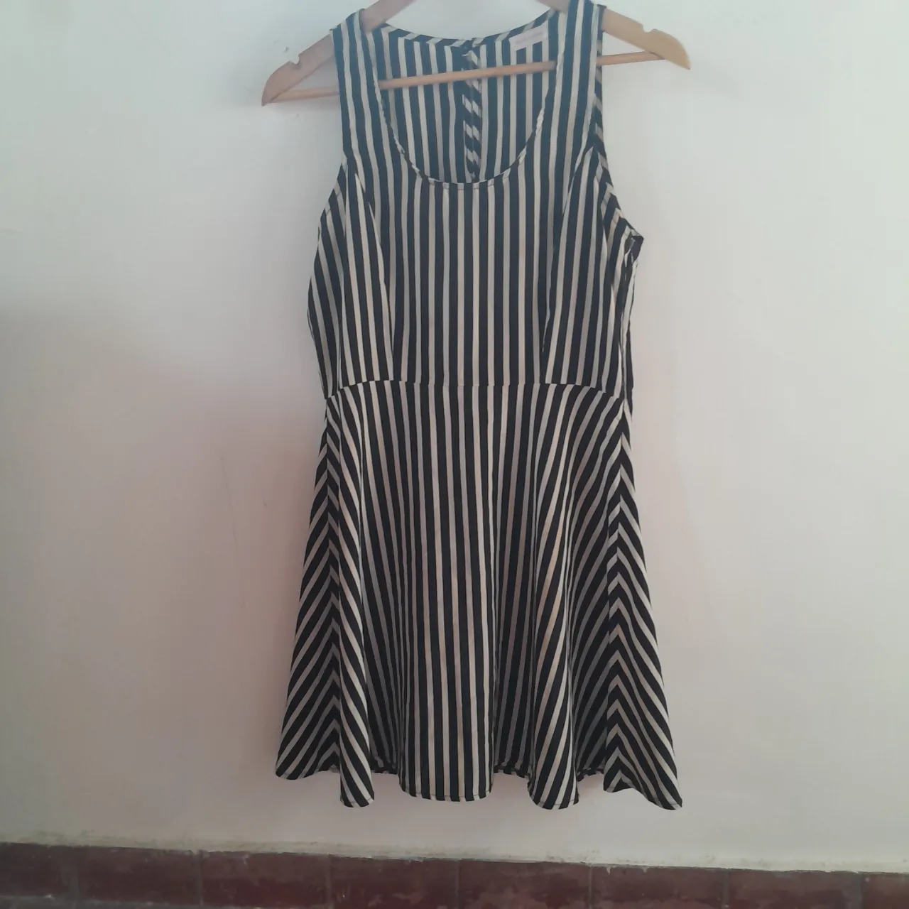 Vestido corto a rayas verticales blancas y negras. Diseño sin mangas y con escote redondo. Ideal para un look casual y fresco.