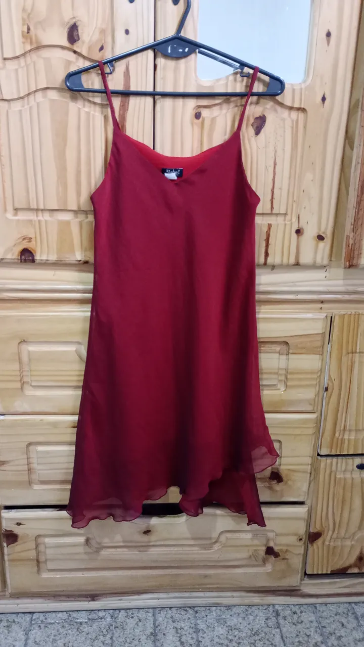 Vestido rojo de breteles finos y escote en V. Posee un ruedo asimétrico con volados. Talle M. El color es entre rojo y marron tornasolado. medidas aprox. en plano: sisa 41 cm, largo desde mos breteles 95 cm aprox.