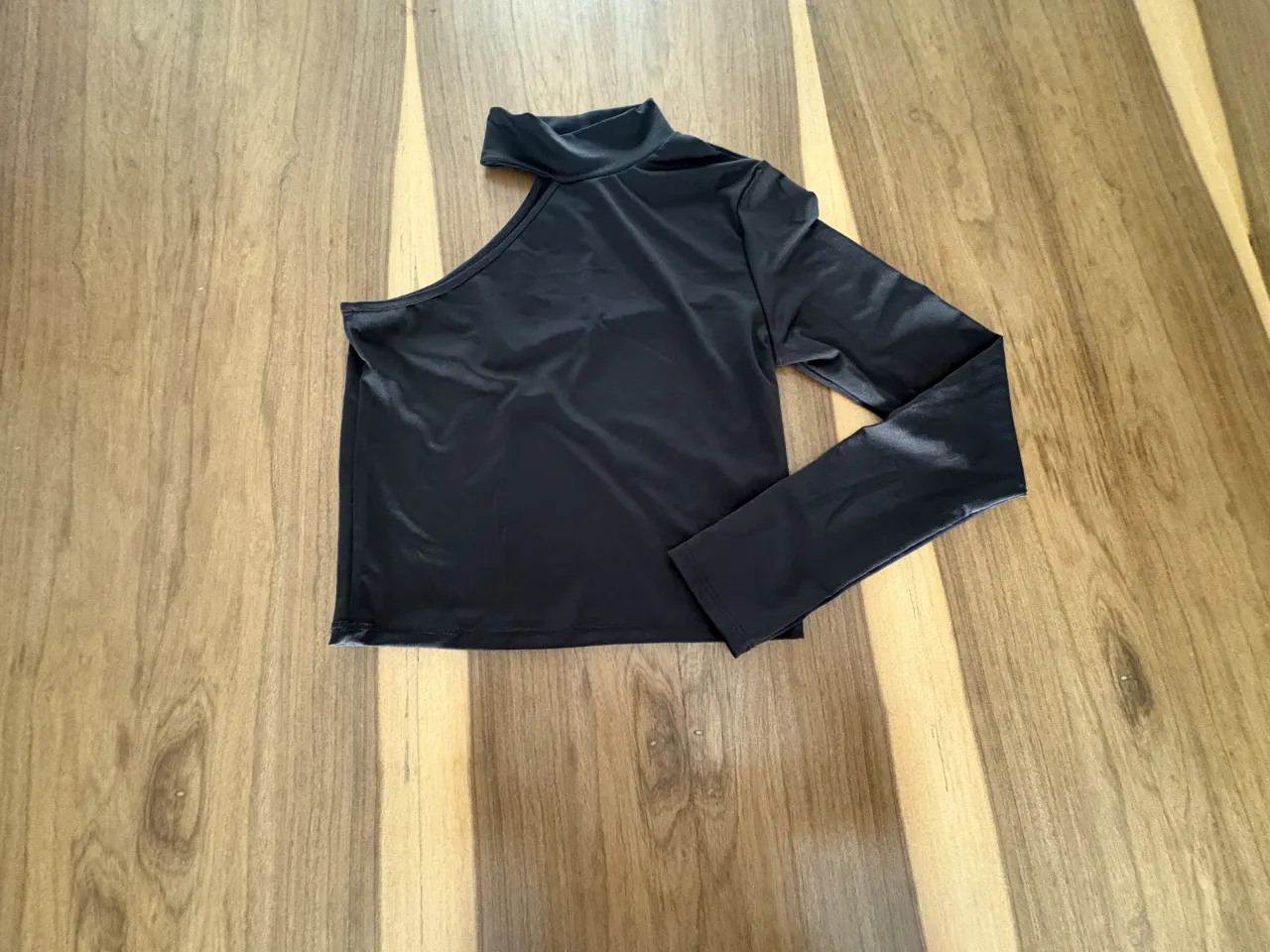 Remera negra de cuello alto con un solo hombro descubierto y manga larga.