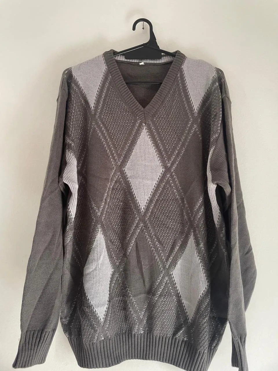 Sweater de tejido de punto con rombos en gris y gris claro. Cuello en V y mangas largas.