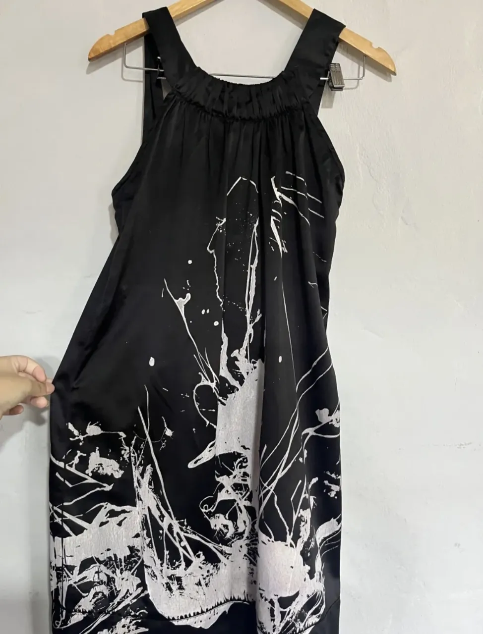 Vestido negro con estampa abstracta en blanco. Breteles anchos y cuello redondo fruncido. Espalda con lazo.