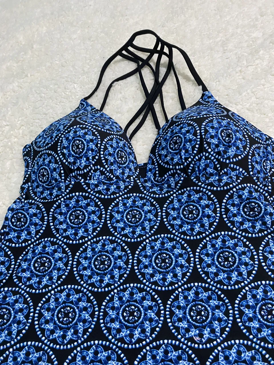 Remera de traje de baño estampada con motivos circulares en tonos azules y negros. Posee breteles finos cruzados en la espalda y un escote pronunciado. Ideal para disfrutar de días de sol y pileta con estilo.