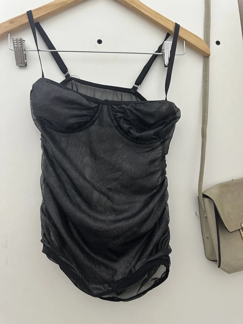 corset de tul negro con brillos y fruncido lateral. Breteles finos regulables. tiene brillos, es talle único sería como para un s u m, la tela tiene elastano y elásticos en las terminaciones por lo cual se estira. TIENE UN SOLO USO!