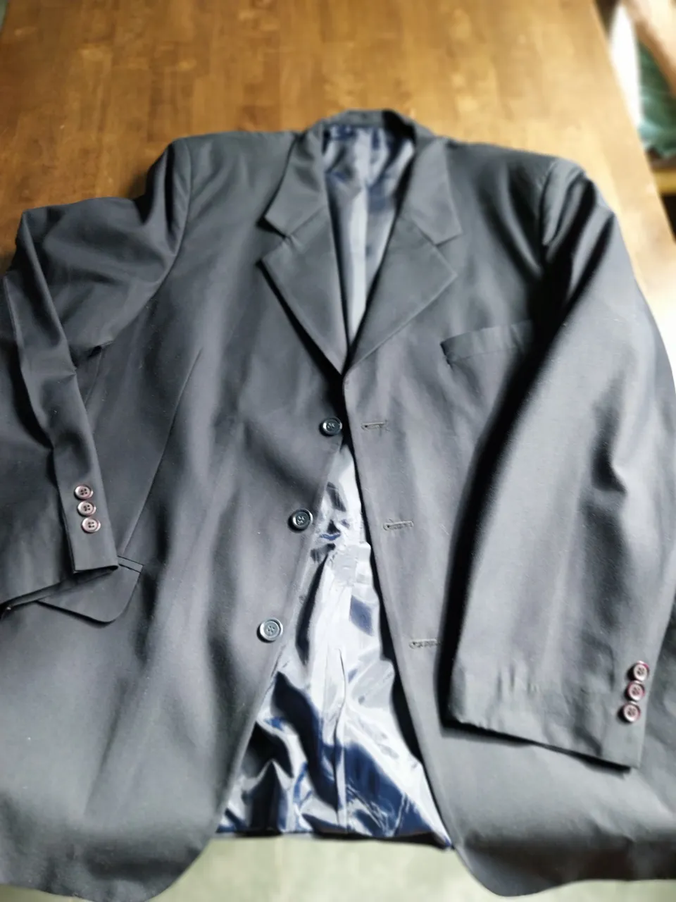 Saco de vestir negro, ideal para eventos formales o para darle un toque elegante a tu look. Cuenta con tres botones al frente y detalles en los puños. Su forro interior es de seda azul, aportando un toque de distinción.