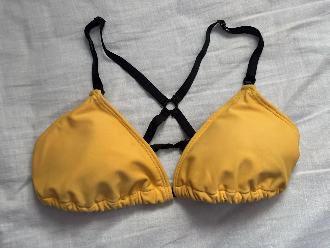 Bikini corpiño amarillo con tiras cruzadas negras. Marca NOXION