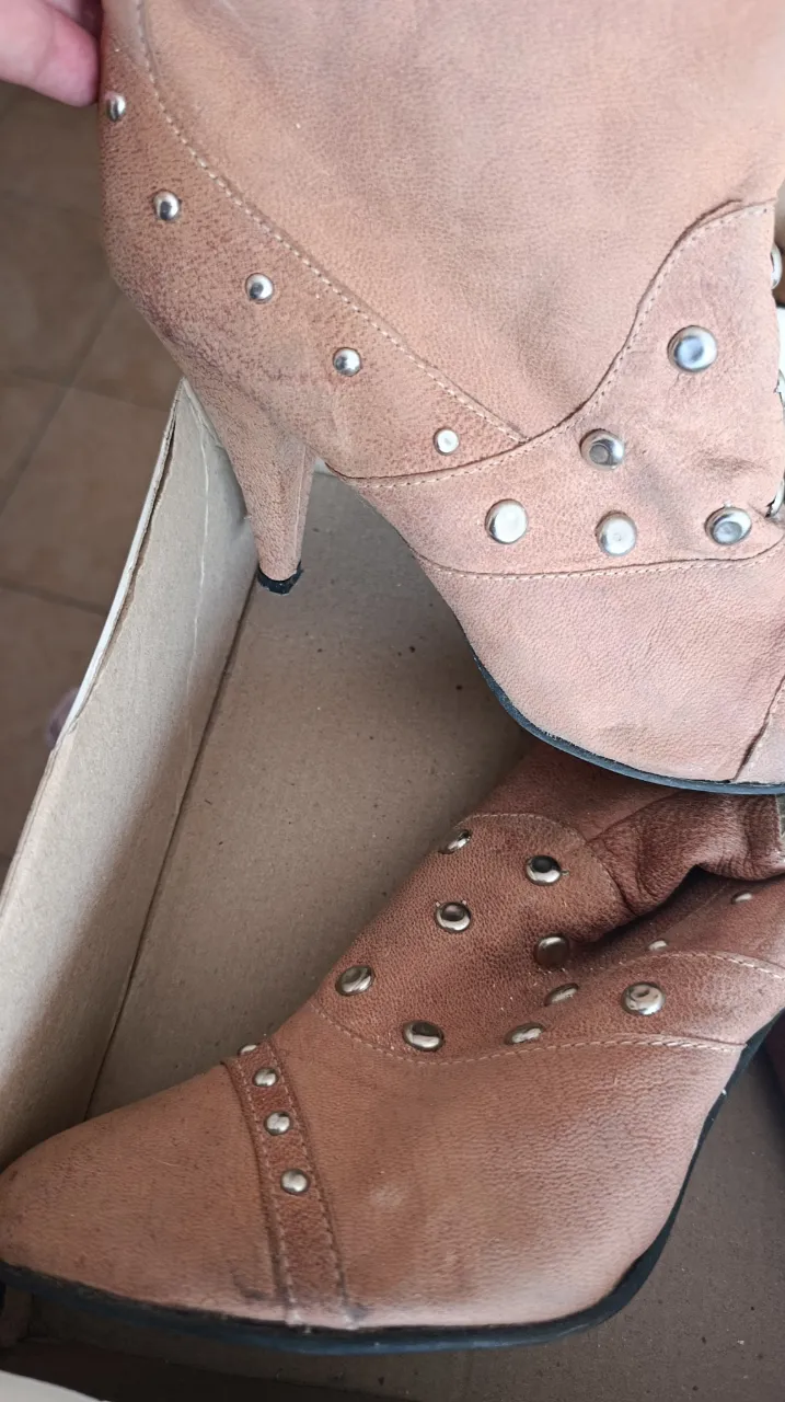 Botitas Lucerna de cuero gamuzado color suela con tachas plateadas. Taco alto y punta fina. Cierre lateral para facilitar el calce. Ideales para darle un toque rockero a tu look. Muy poco uso