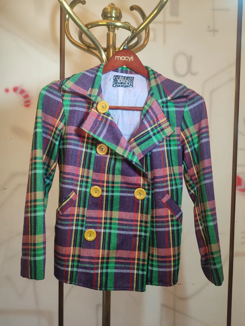 Campera corta a cuadros escoceses en tonos de morado, verde, naranja, amarillo y negro. Posee doble abotonadura con botones amarillos grandes y solapas clásicas.Medidas en plano .Ancho de hombros 40cm ancho de sisa 46cm largo 62cm