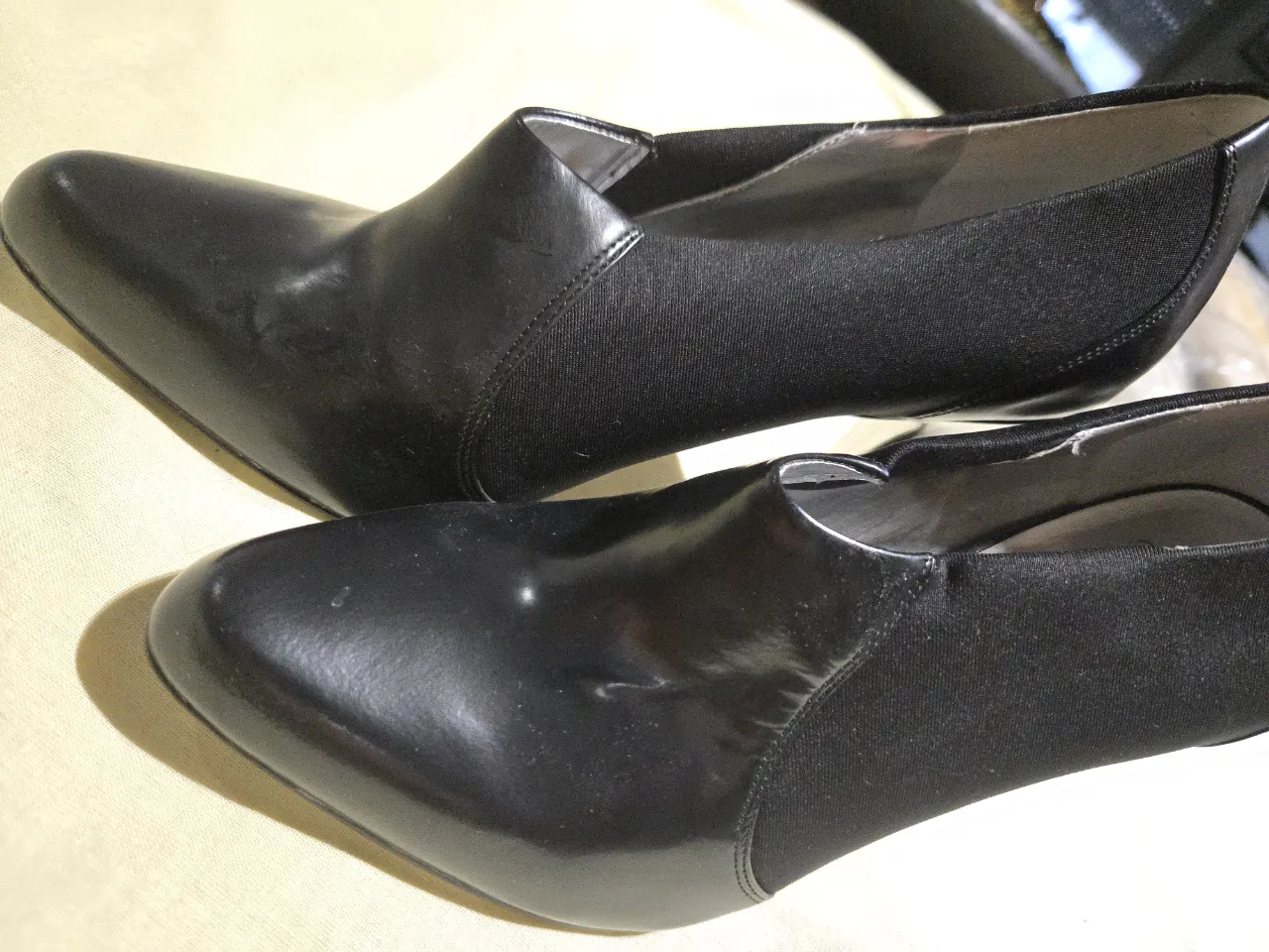 Zapatos negros de taco alto con detalles elásticos en los laterales.