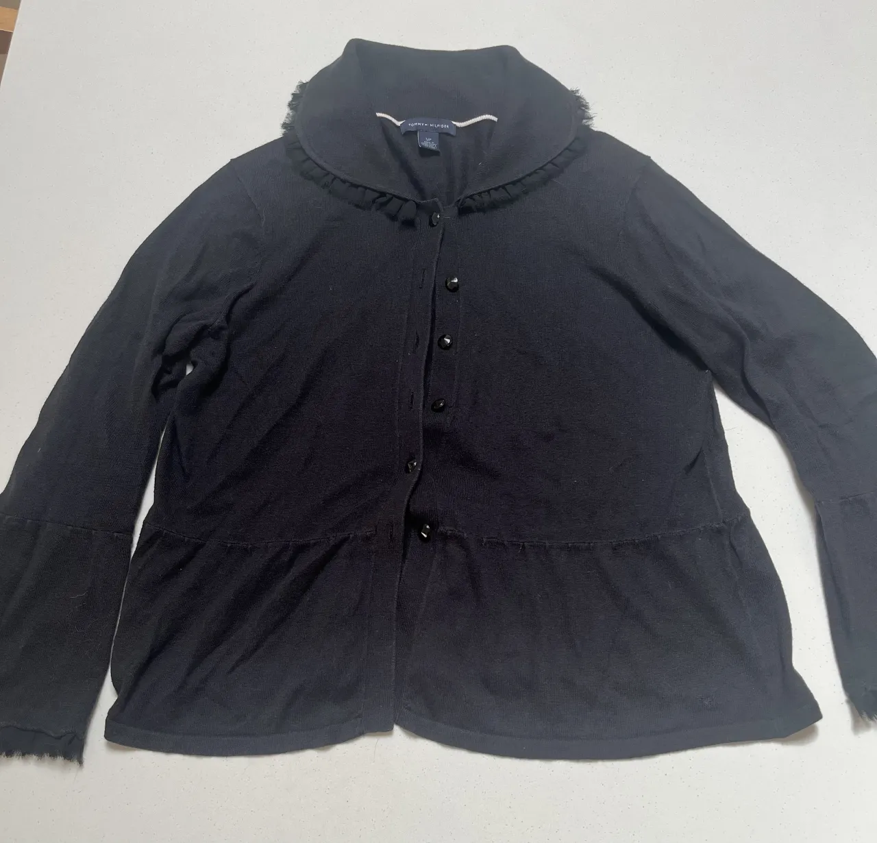 Cardigan de tejido negro con botones y detalles de volados de tul en el cuello y puños. Ideal cambio de estación. El material es una lanilla finita muy suave. Ideal para un look casual y elegante.