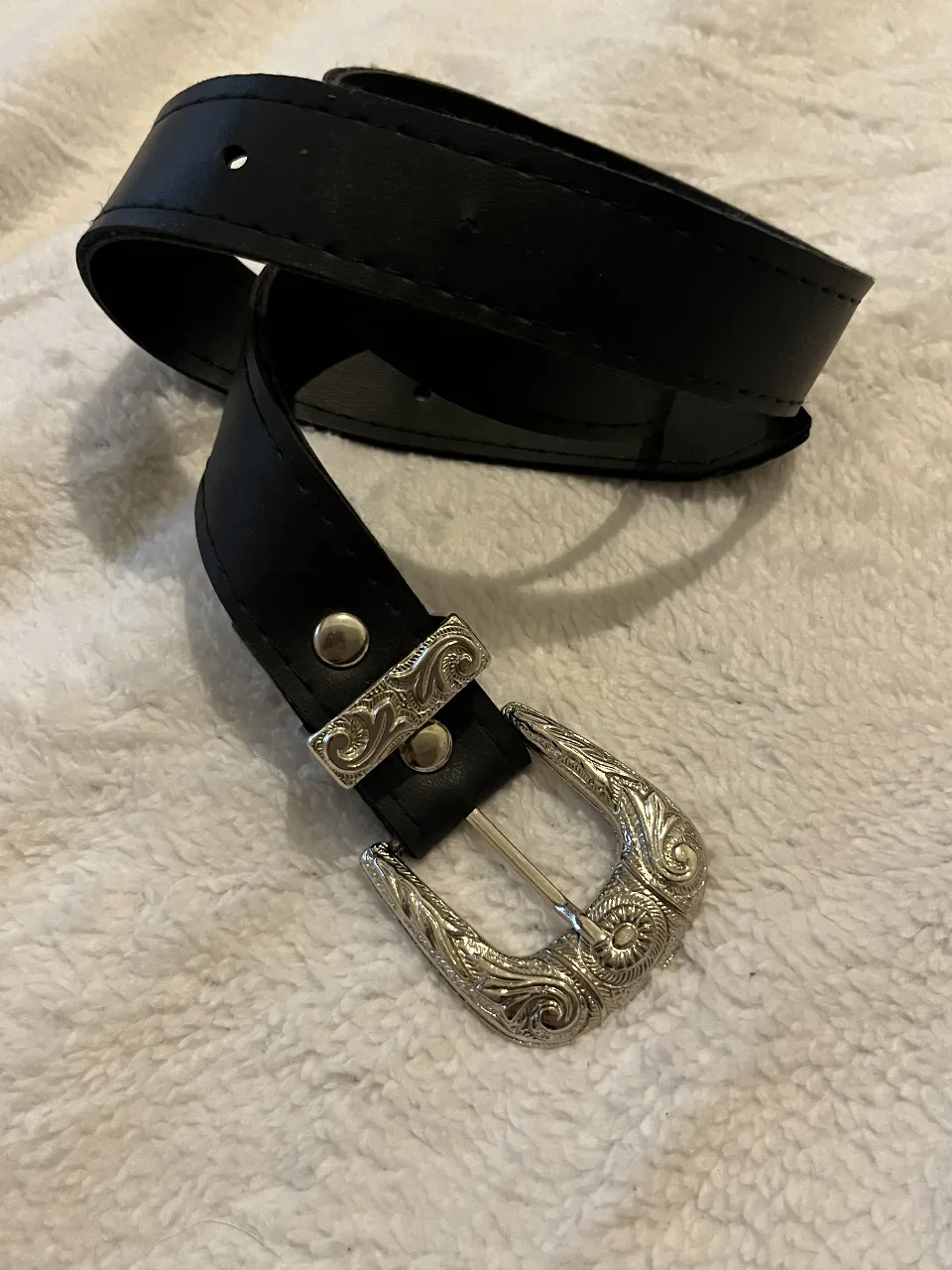 Cinturón negro con hebilla plateada estilo western, ideal para complementar tus looks.