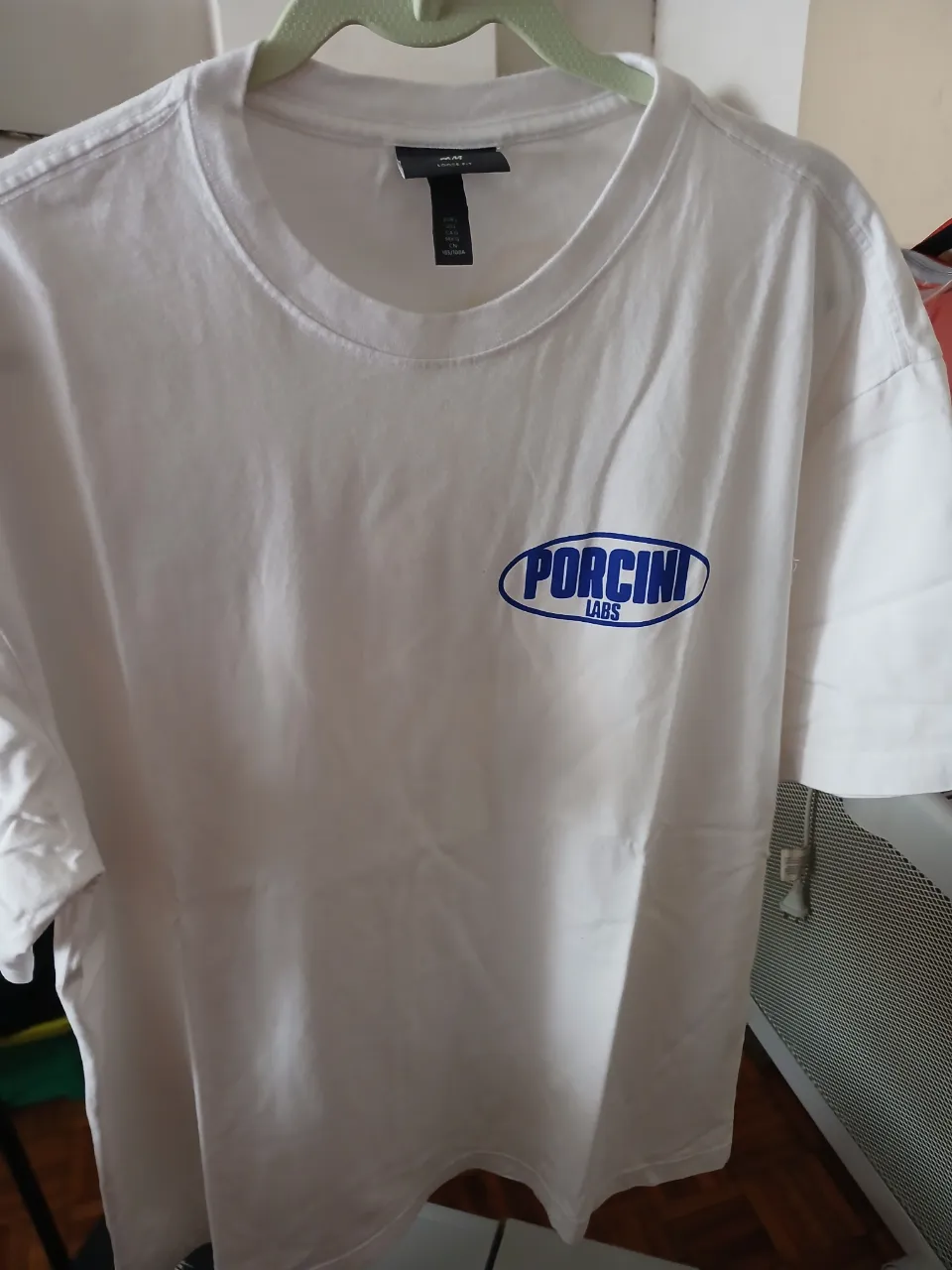 Remera blanca de H&M, corte oversize, con estampa "PORCINI LABS" y hongos en la espalda. Ideal para un look casual y moderno.