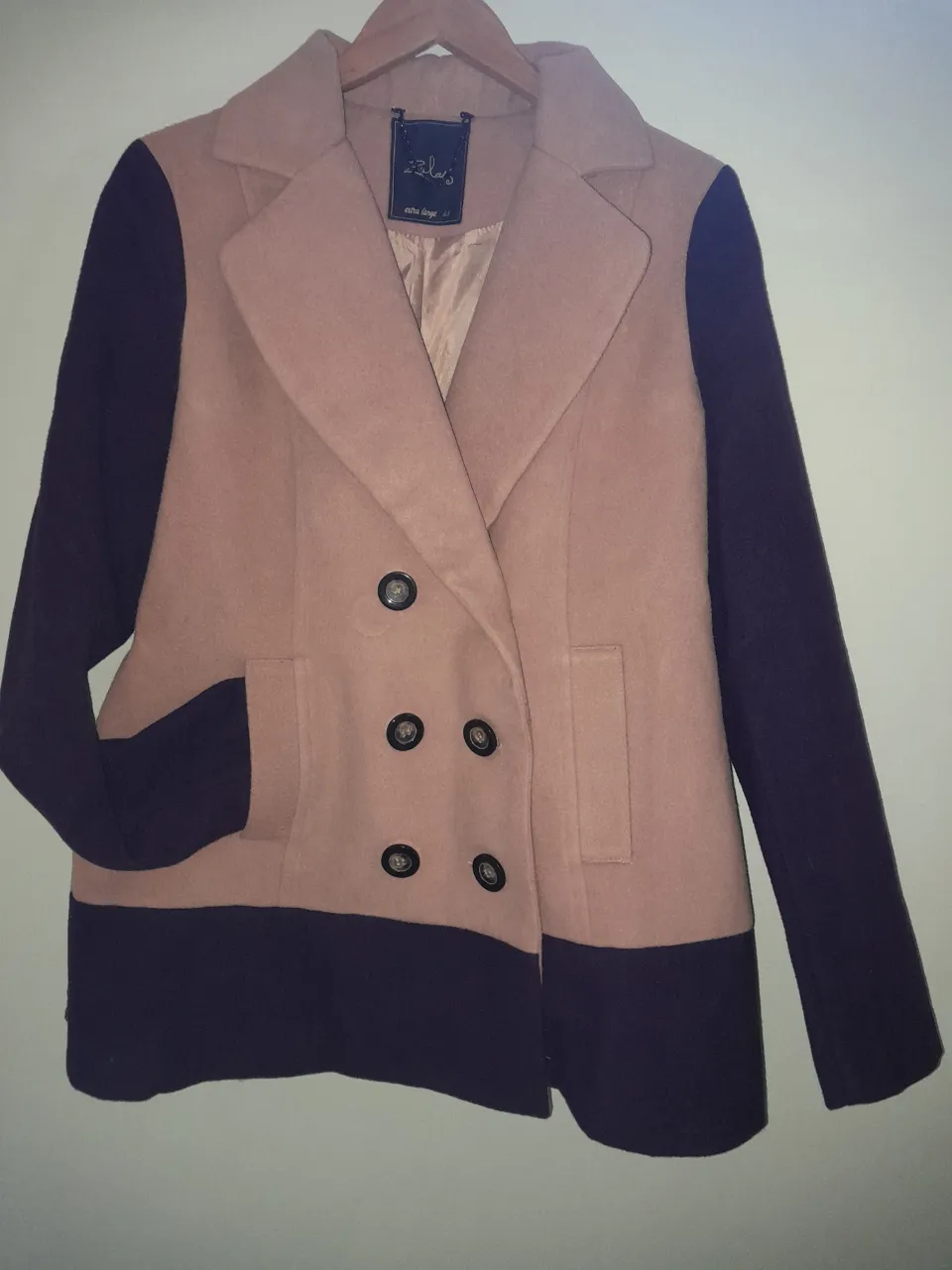 Campera de paño color camel con mangas y parte inferior en color violeta. Tiene cuello solapa y doble abotonadura.