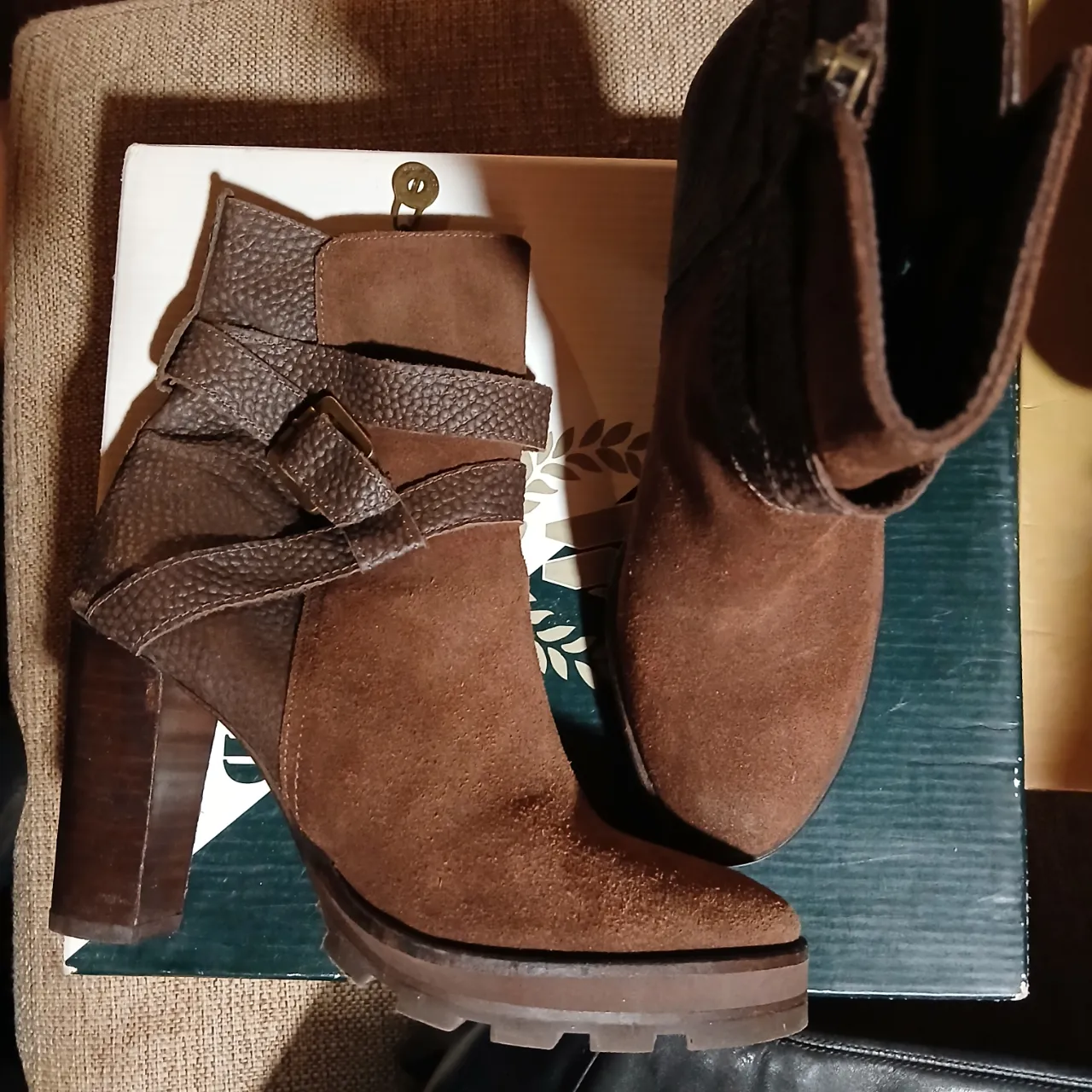Botas de cuero marrón con taco alto y detalles de tiras y texturas. Ideales para un look canchero y con estilo.
