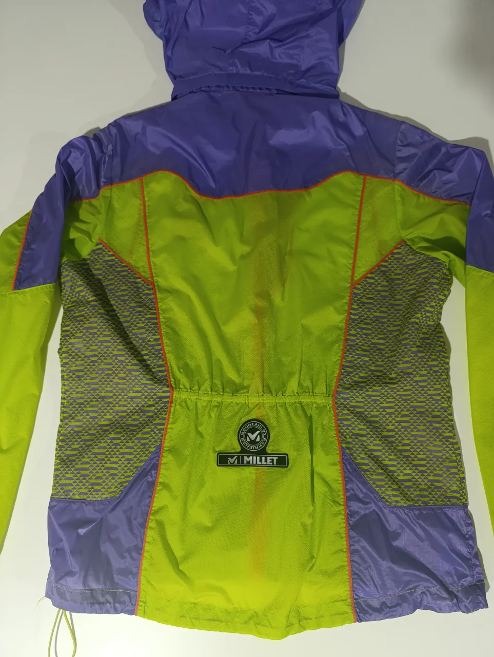 Campera deportiva Millet, ideal para actividades al aire libre. Diseño vibrante en verde lima y violeta, con detalles en naranja. Perfecta para running o senderismo.
