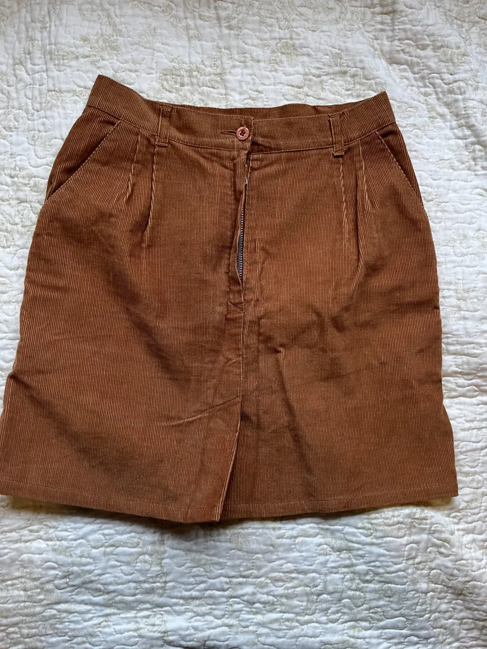 Pollera de corderoy marrón, tiro alto, con bolsillos y cierre. Ideal para un look casual y canchero.