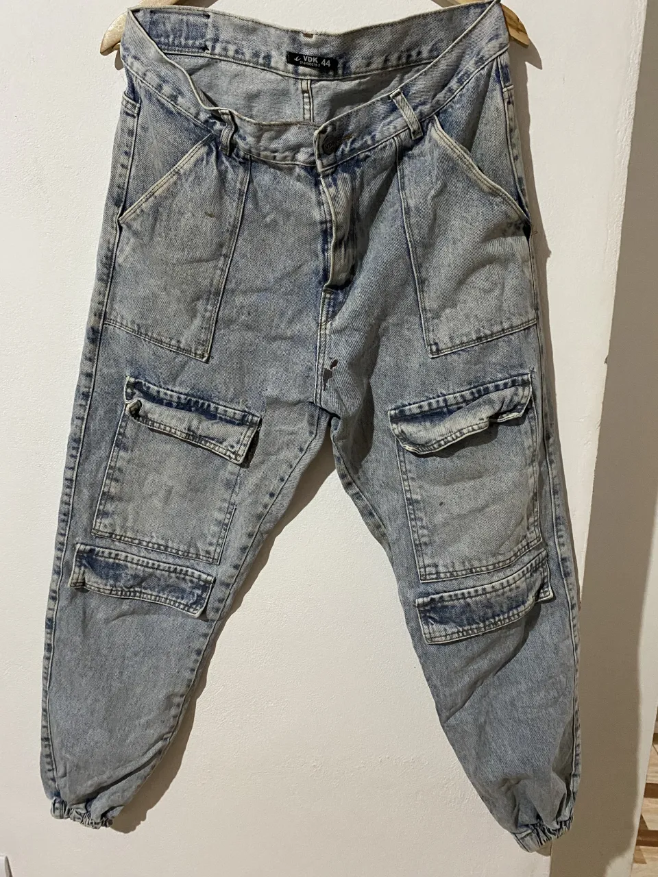 Jean de tiro alto con múltiples bolsillos cargo. Lavado celeste desgastado.
