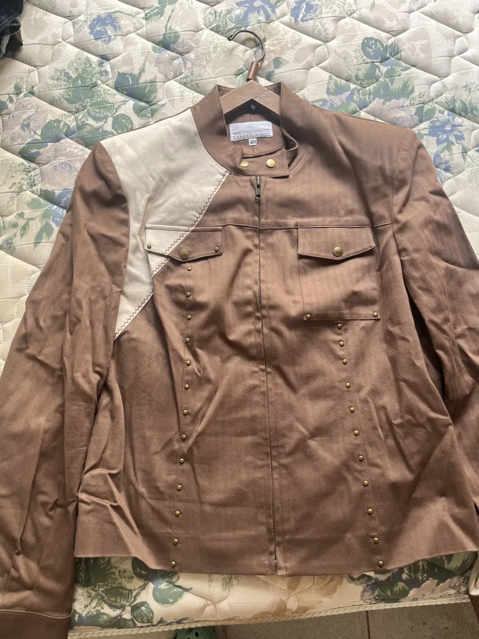 Conjunto de chaqueta y pantalón de vestir color marrón y beige. La chaqueta tiene detalles de tachas doradas y bolsillos frontales. El pantalón es recto y de tiro alto, con costuras decorativas y detalles en la cintura.