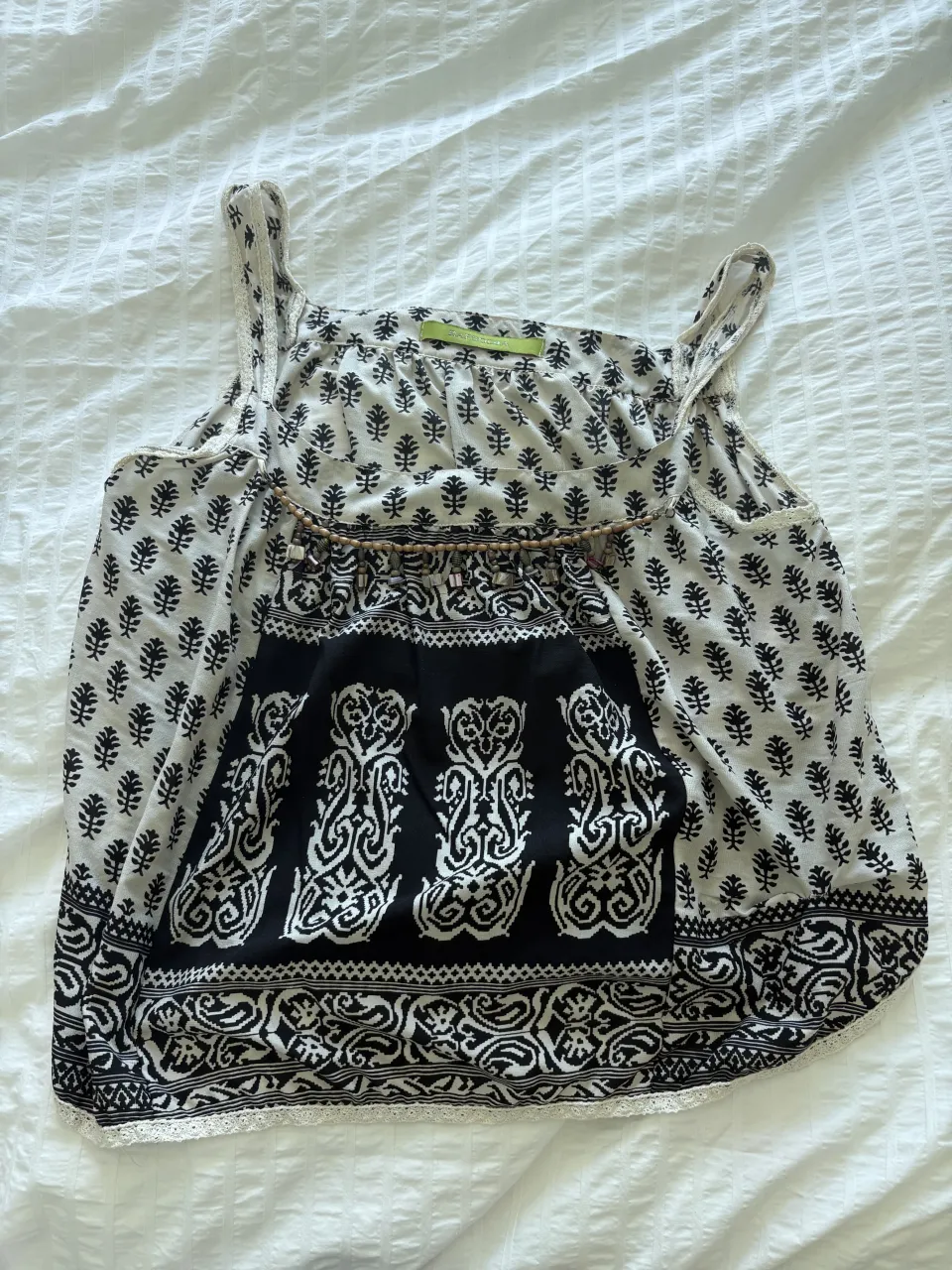 Musculosa estampada con detalles de encaje en el borde inferior. Ideal para un look fresco y bohemio.