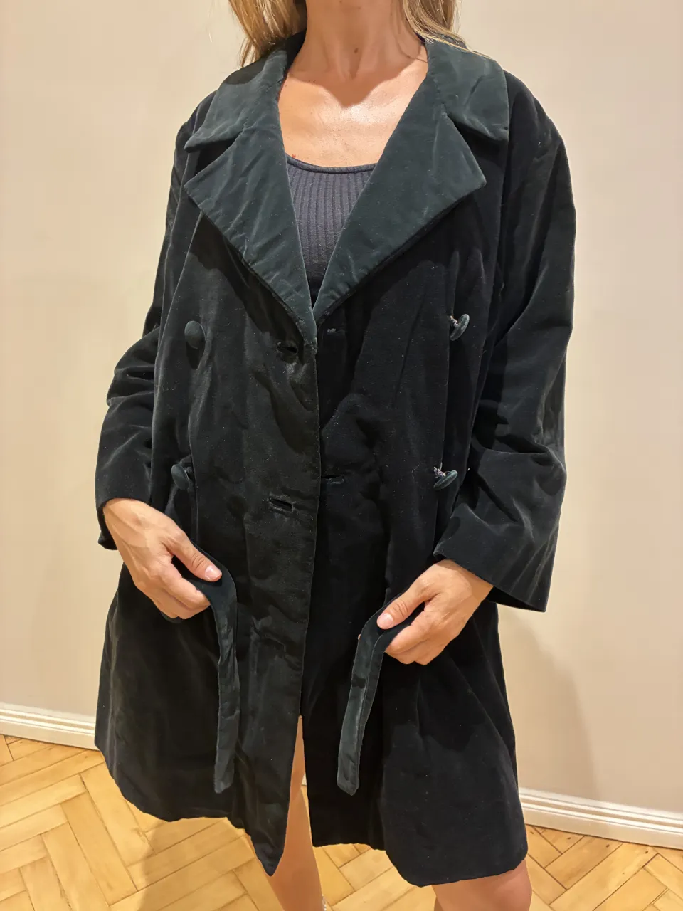 Abrigo de pana negro, ideal para un look elegante y sofisticado. Posee botones al frente y un cinturón para ajustar a la cintura. Perfecto para las noches frescas de otoño o invierno.