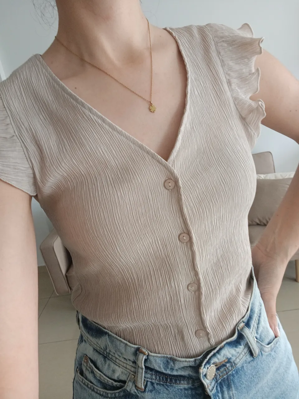 Blusa AMELIA BAIRES color beige, con escote en V y botones funcionales al frente. Mangas cortas con volados. Tela: crepè elastizado. Medidas: contorno de busto 80cm, largo 50cm.