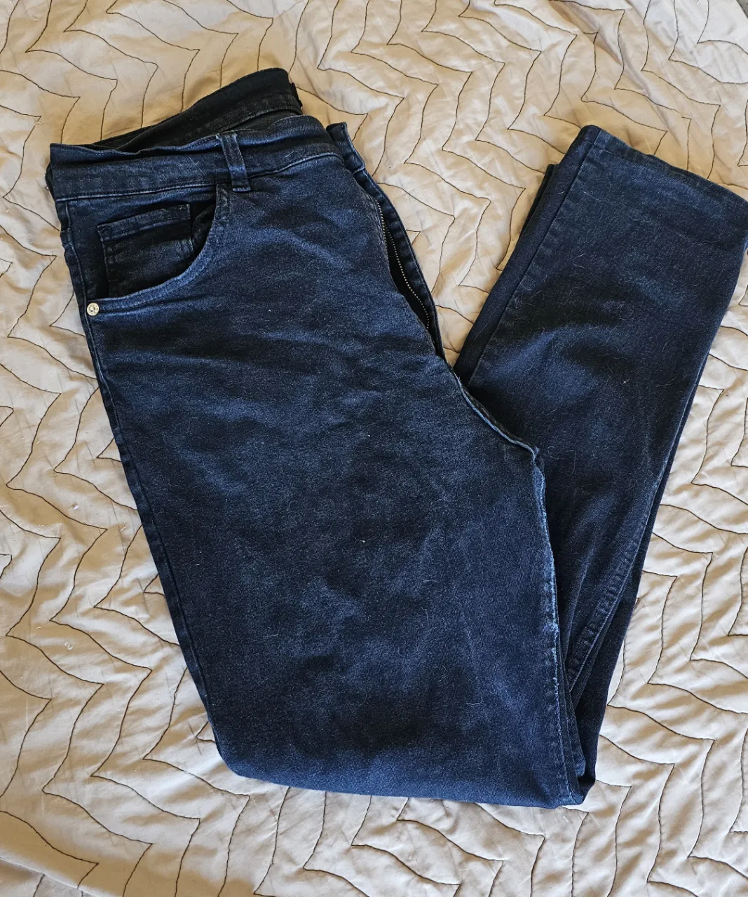 Jean negro, tiro alto, chupín de gabardina elastizada, talle 46, detalles de uso (desgaste del color de la tela) (ver fotos)