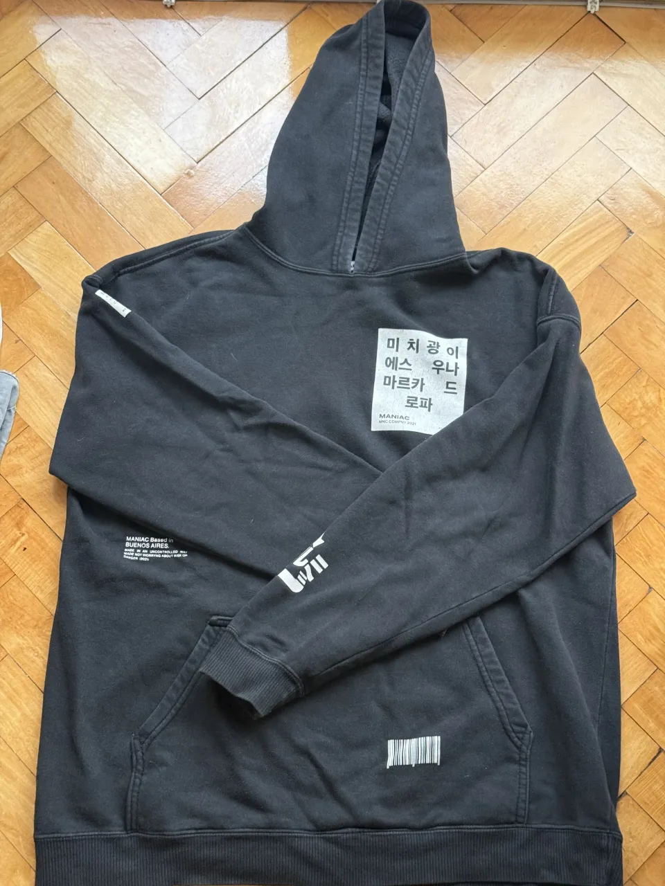 Buzo oversize con capucha negro, con estampa en coreano en el frente y detalles gráficos en las mangas. Ideal para un look urbano y moderno.