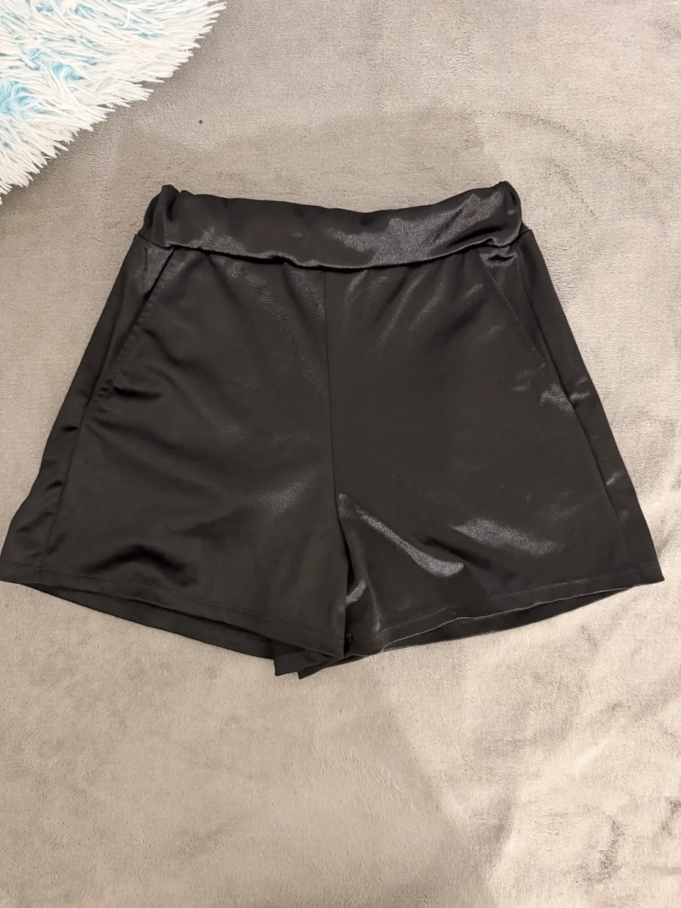 Shorts negros de satén con cintura alta y bolsillos. Ideales para un look canchero y elegante.