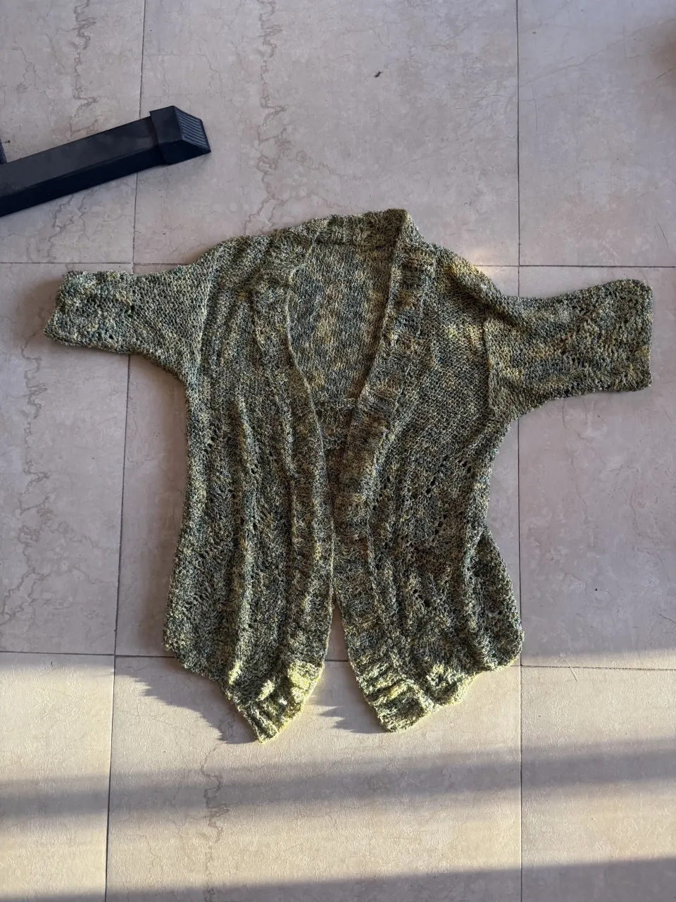 Cardigan tejido de hilo con mangas cortas y escote en V. Posee un estampado jaspeado en tonos verdes y amarillos.