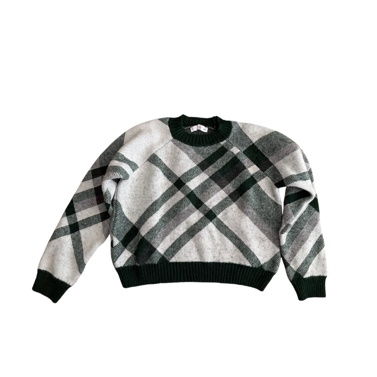 Sweater de tejido a cuadros en tonos grises y verde oscuro. Cuello redondo y puños tejidos. El sweater está nuevo, sin uso. Medidas tomadas en plano: ancho de axila a axila 58/62 cm (según cómo se estire), largo total 50 cm y largo de manga 60 cm.