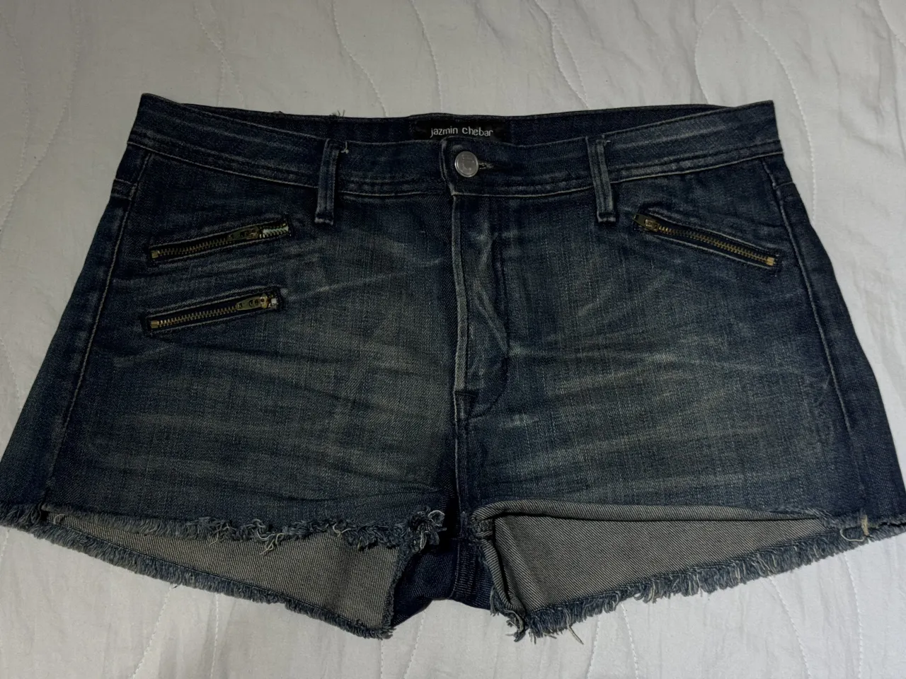 Shorts de jean tiro bajo con detalles de cierres metálicos en los bolsillos delanteros y terminación desflecada en el ruedo. Un básico canchero para looks informales. Cierres de vista azules por corrosión.