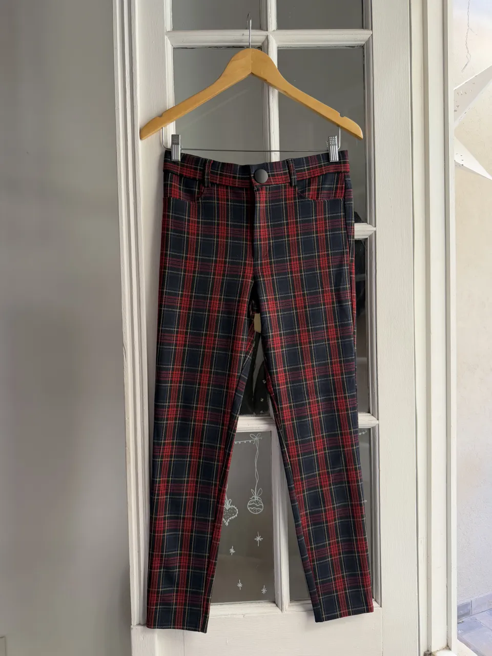 Pantalón de cuadros escoceses en tonos rojo, azul marino y amarillo. Posee un botón a presión en la cintura y bolsillos.