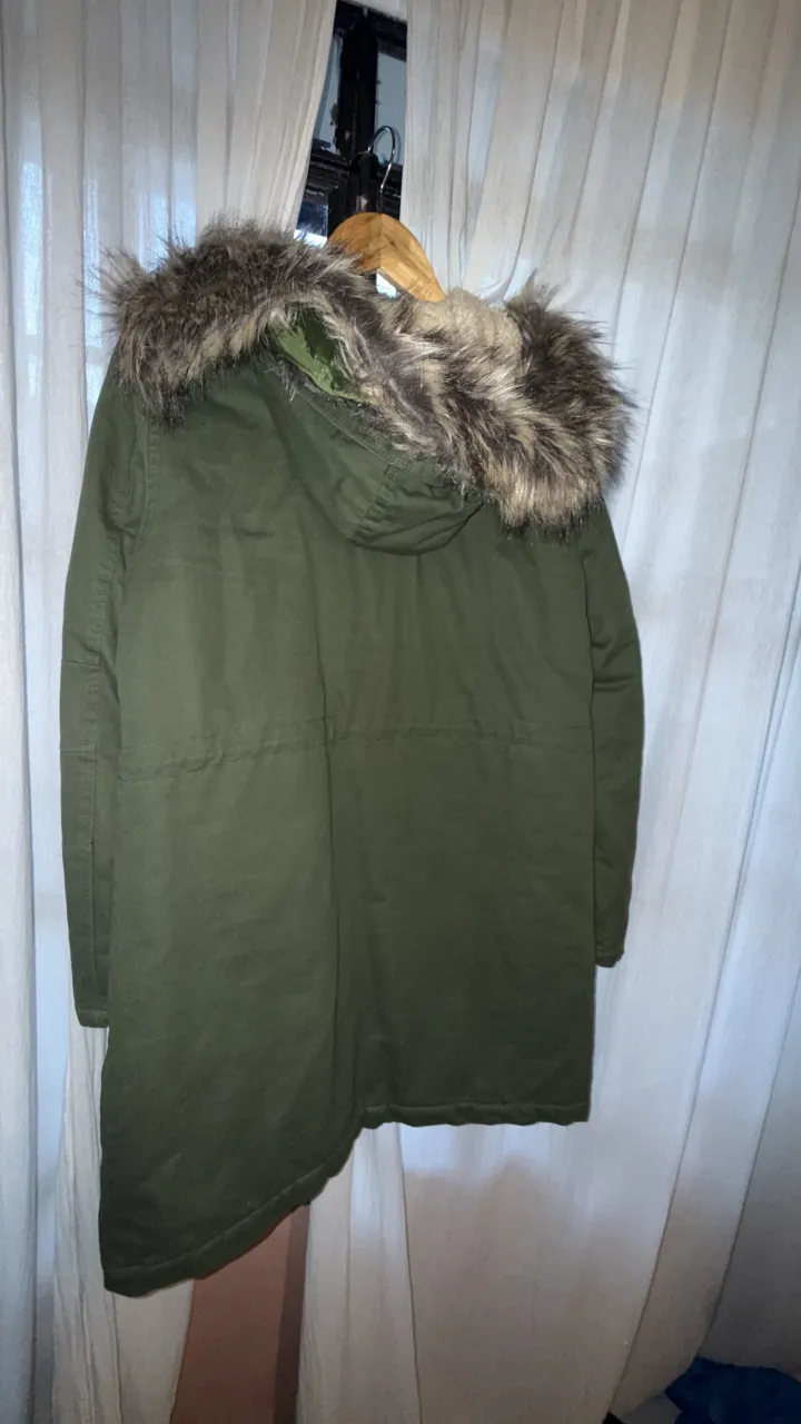 Parka verde con capucha forrada en piel sintética. Interior forrado en corderito color crudo. Tiene bolsillos frontales con tapa cierre y botones. muy abrigada