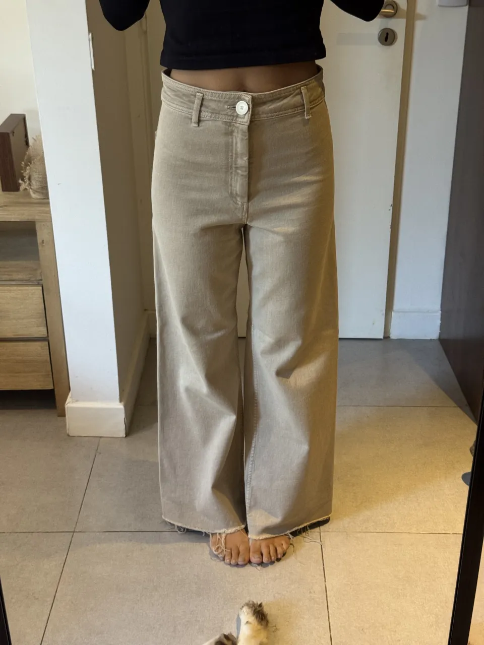 Pantalón ancho de jean color tiza, tiro alto, con roturas desflecadas en los bajos. Un básico canchero para armar looks modernos.