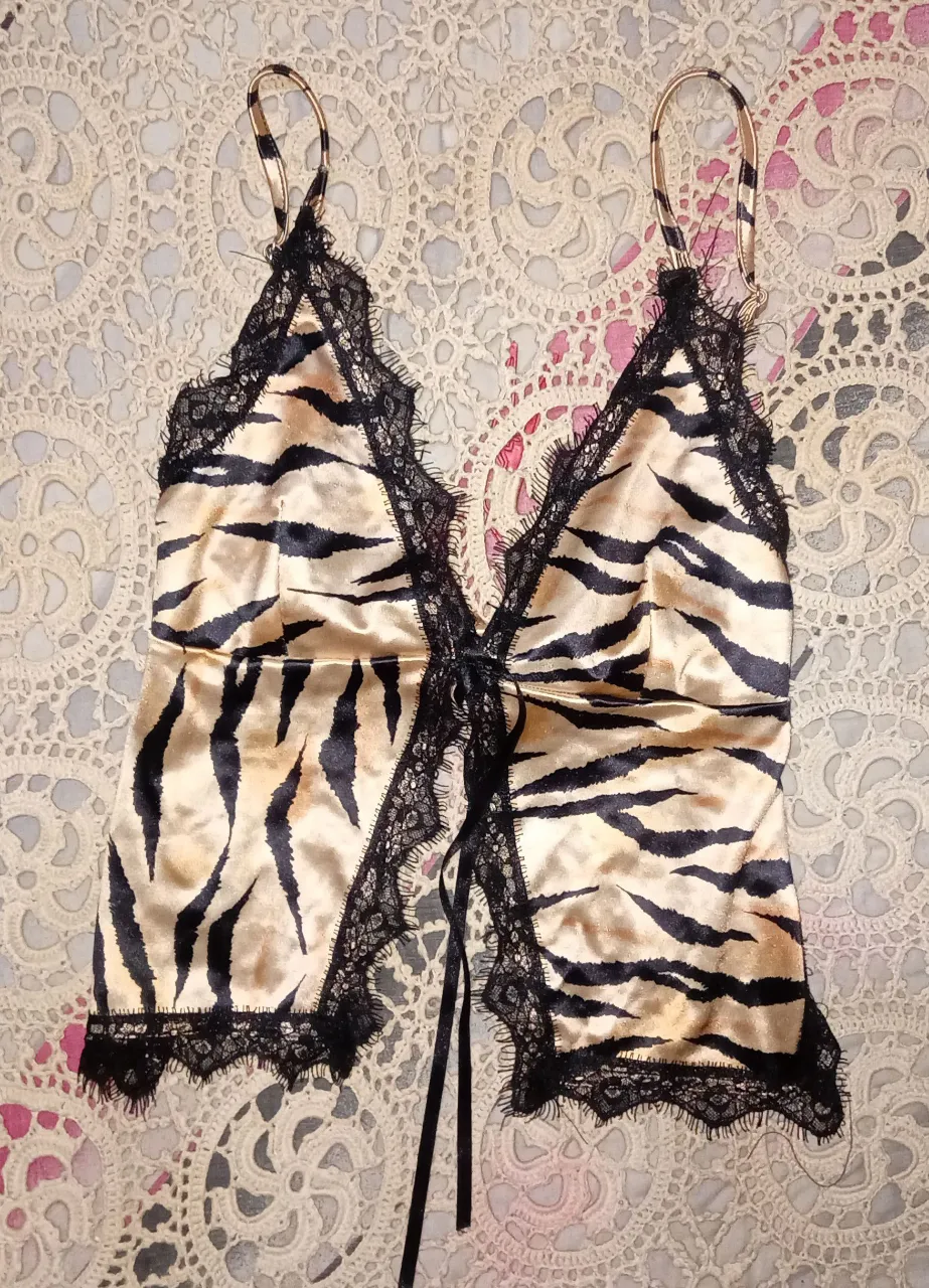 Top de satén con estampa animal print de cebra y detalles de encaje negro. Breteles finos regulables y lazo para atar en la espalda. Ideal para un look audaz y sensual.