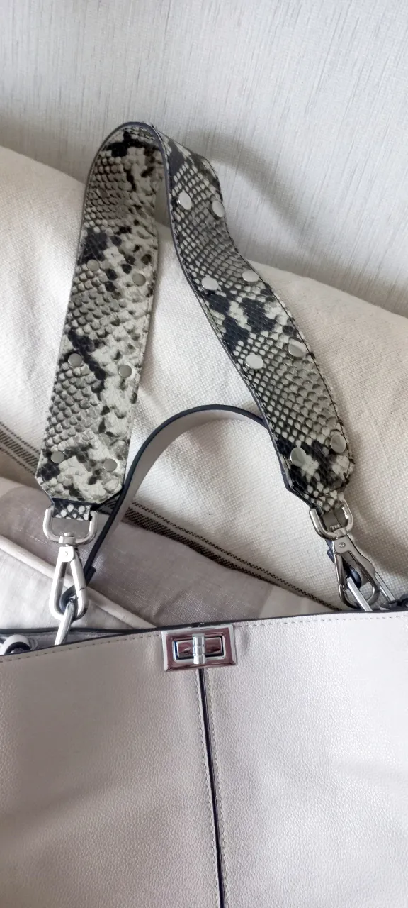 CORREA Cuero PRÜNE( no cartera) animal print con estampado de serpiente en tonos blanco, negro y gris. Posee 2 caras con detalles tachas metálicos de diferentes tamaño en cada lado. Es para usar al hombro no para cruzar y ganchos para sujetar en extremos . Tendencia temporada