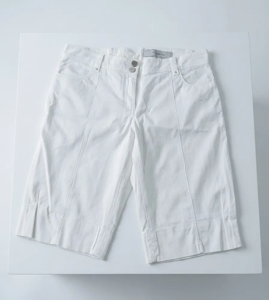 Shorts blancos de gabardina, tiro alto, con detalles de costura y dobladillo en la botamanga. Perfectos para un look casual y fresco de día.